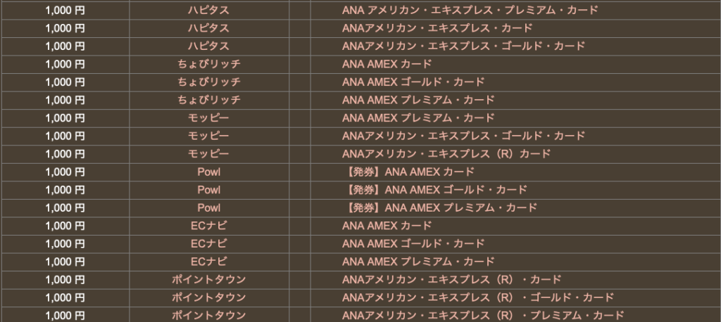 ANAアメックス(一般)とANAアメックスゴールドについては6つのポイントサイトで案件が見つかりました。