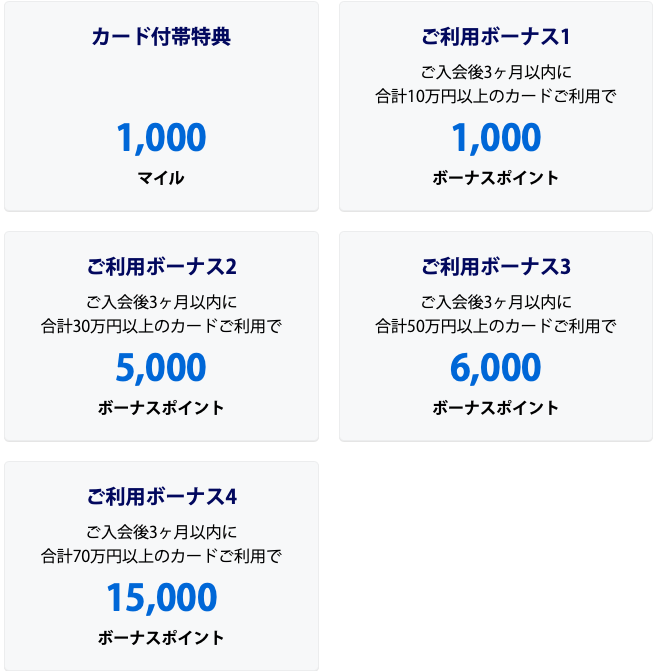 ・「ボーナスマイル」は、入会キャンペーンにおいてカード利用額の条件を満たすともらえるマイルのことです。
