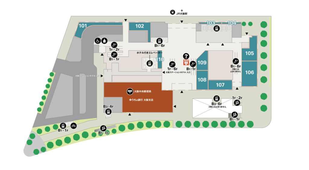KITTE大阪1Fフロアガイドの中央にホテル入口があります。