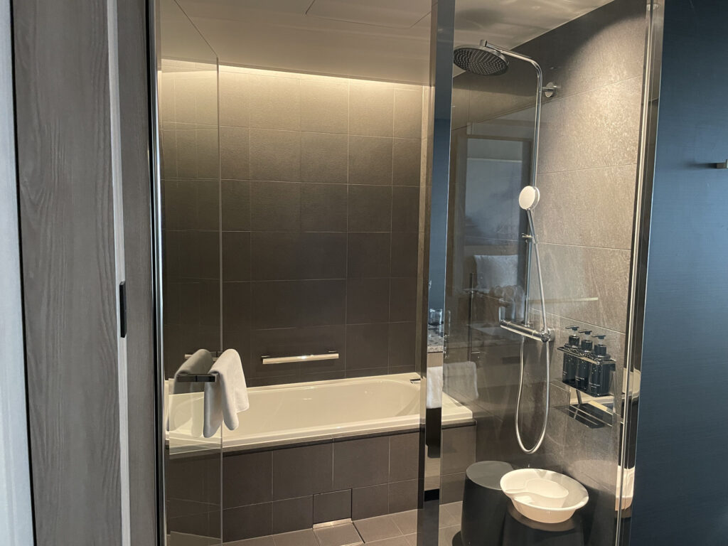 外資系ホテルにありがちな天井シャワーもありますが、薄っすら絵が描いてありますので、水ごりの被害には会わずに済みます。
